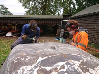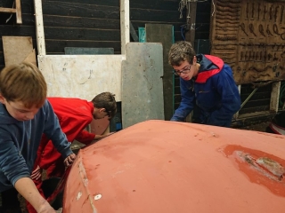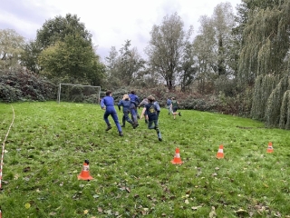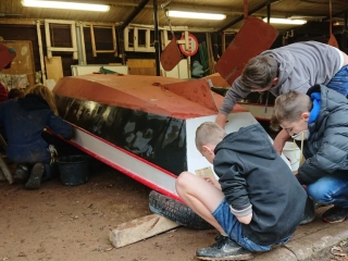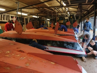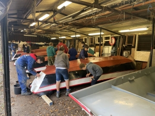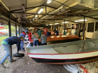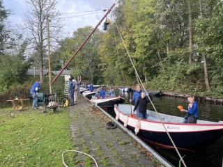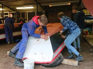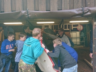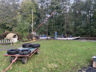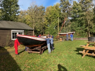 Dit weekend is het winterseizoen begonnen met het eruit takelen van de boten. Eenmaal op de kant en in de botenloods zijn de boten omgedraaid om zo eerst aan de onderkant te kunnen werken.De verkenners zijn begonnen met de eerste werkzaamheden aan de boot , zo is de losse verf op het onderwaterschip verwijderd en is er begonnen aan het slijpen van het zwart en wit van de boot.Ook hebben we nog aan het eind van de middag spellen gespeeld zo werd er fanatiek mee gedaan aan pionnenroof en British Bulldogs.