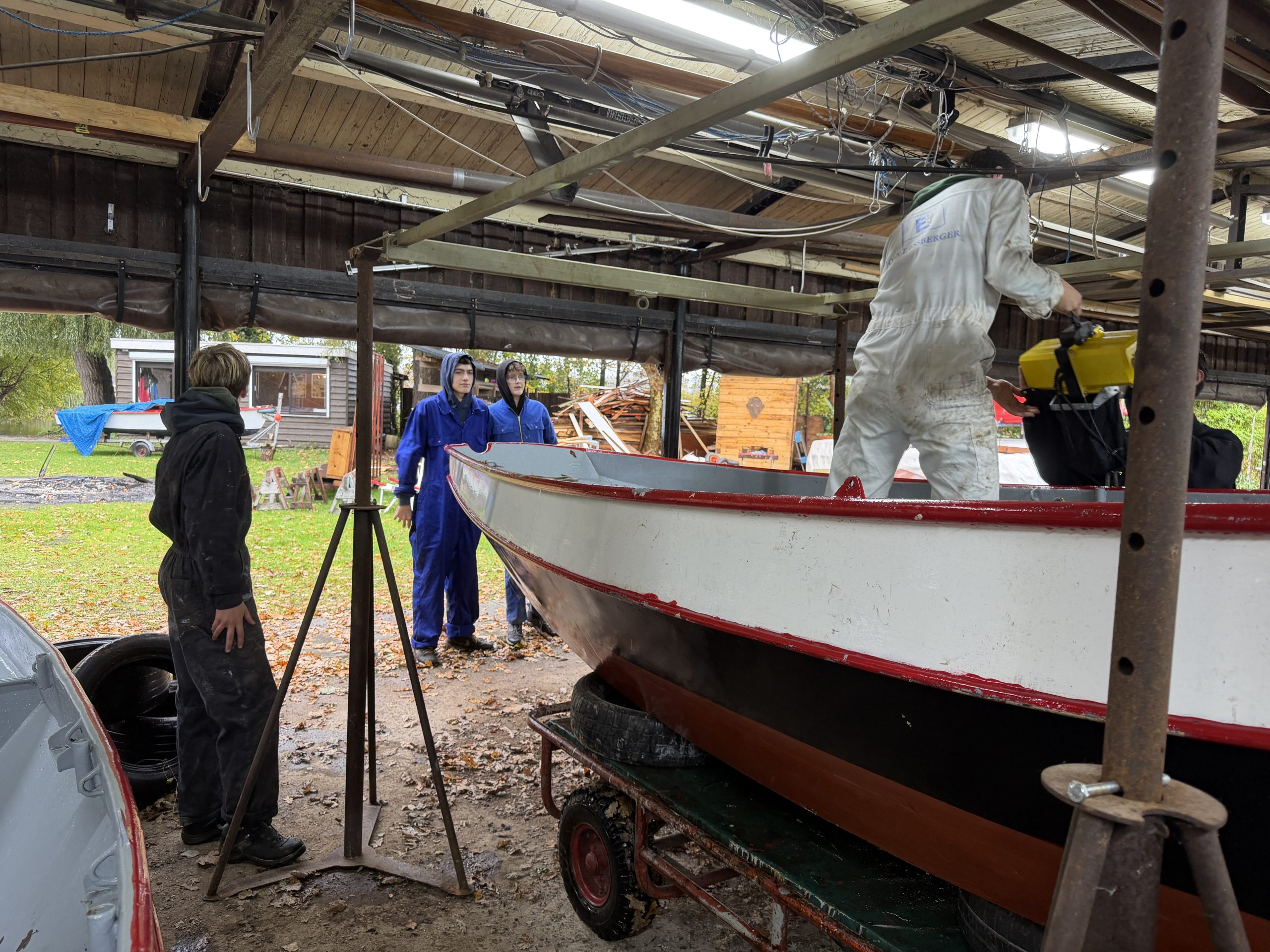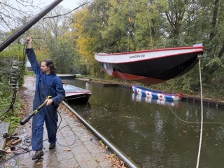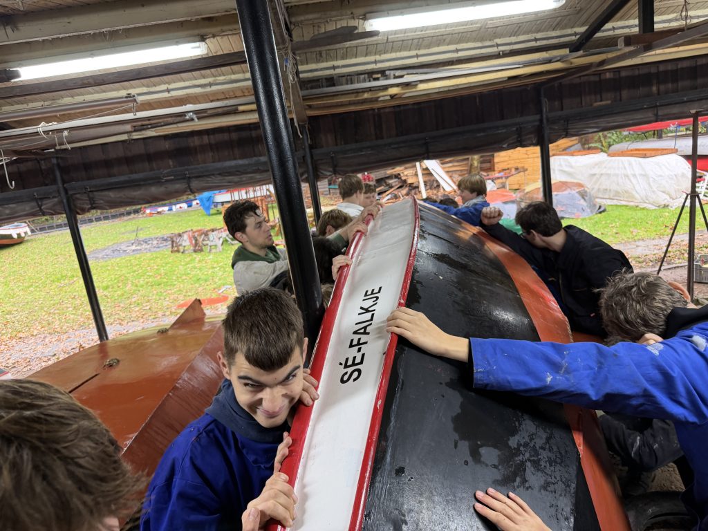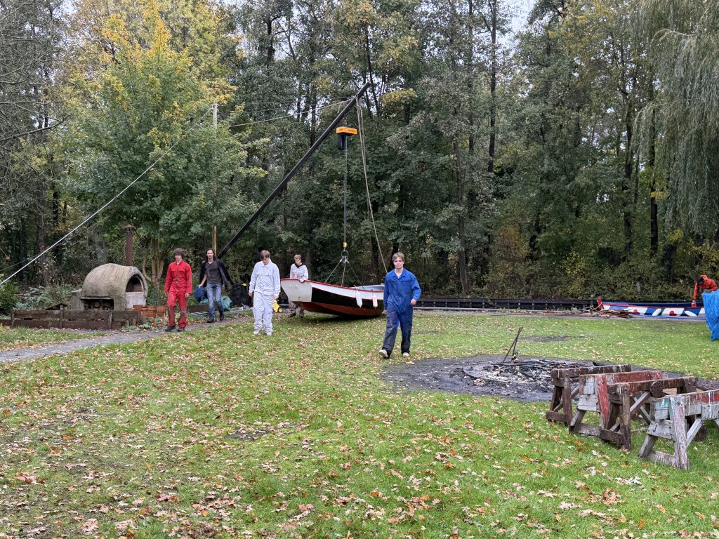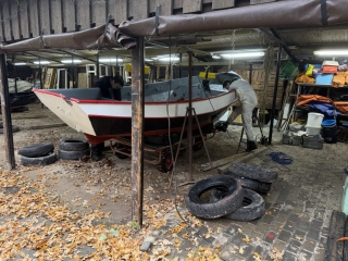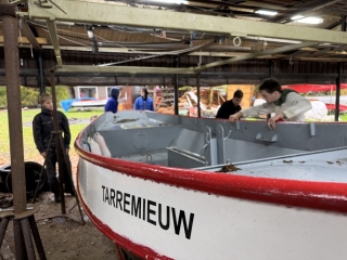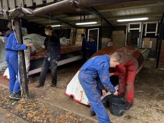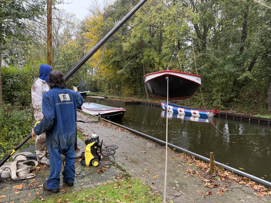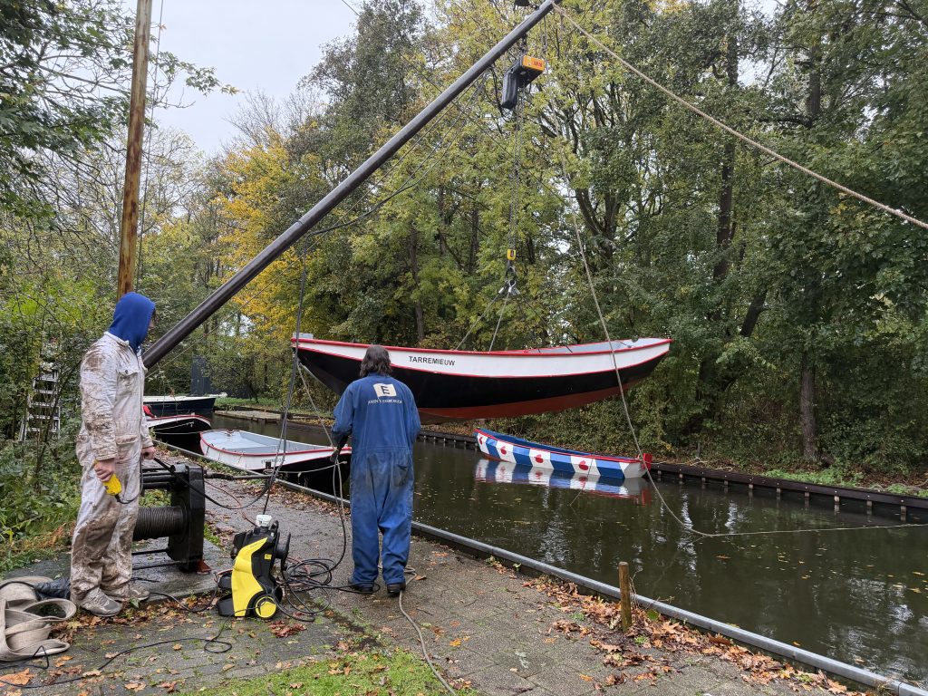 ’s Ochtends zijn we vol energie aan de slag gegaan! De boten werden één voor één uit het water getakeld en naar binnen gereden. Daar draaiden we ze om, zodat we meteen konden starten met het onderwaterschip en nog voor het einde van de dag zat de eerste verflaag er al weer op!