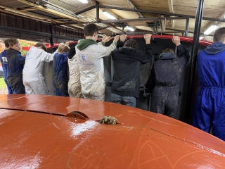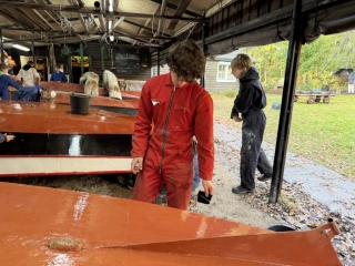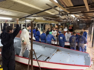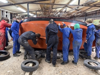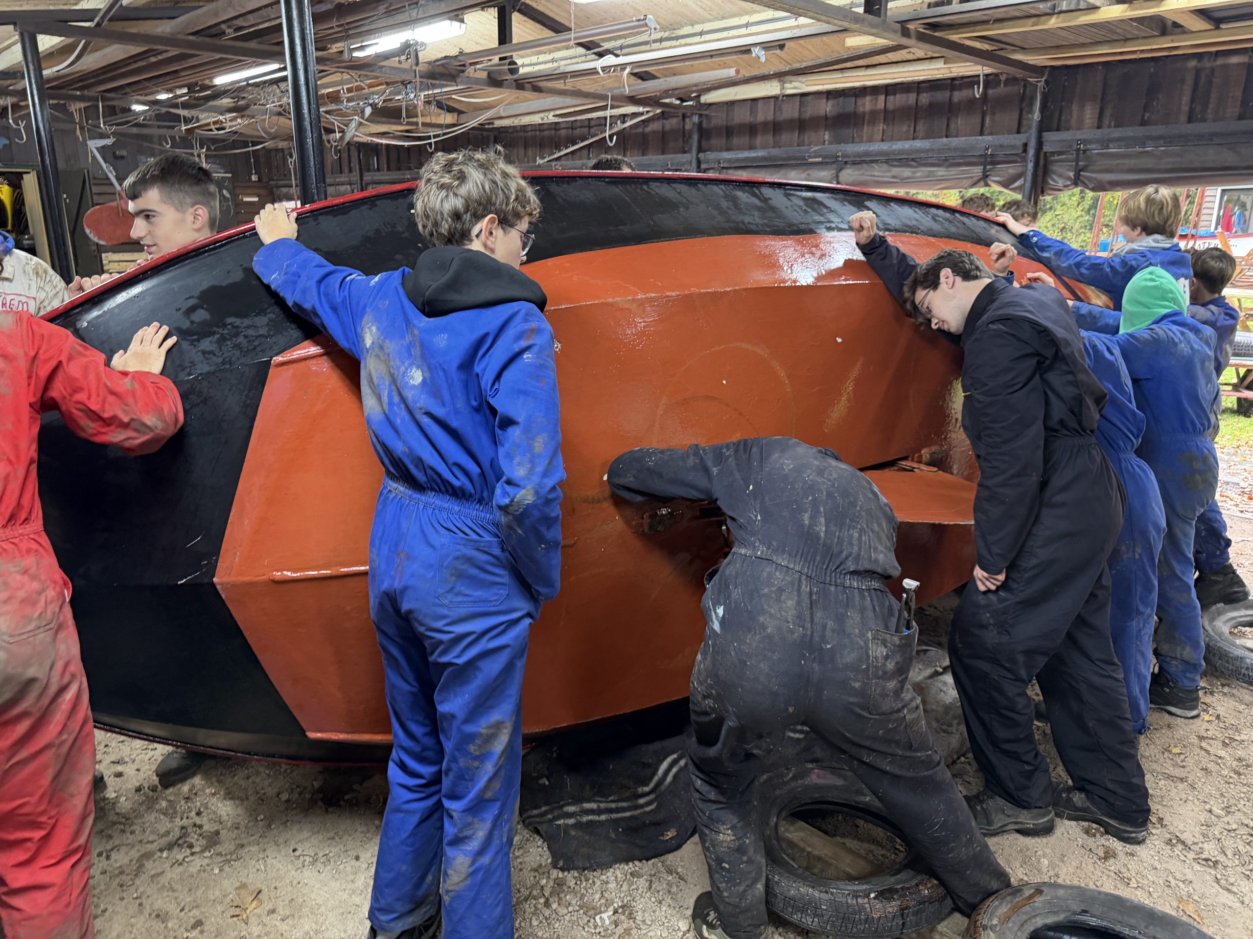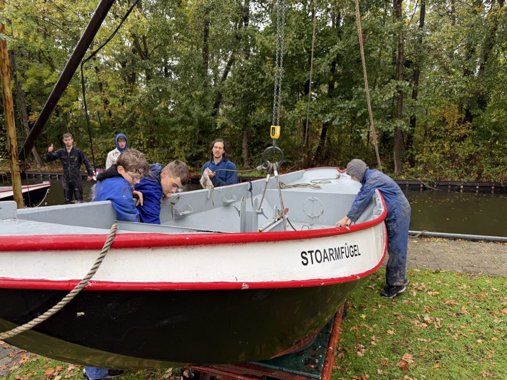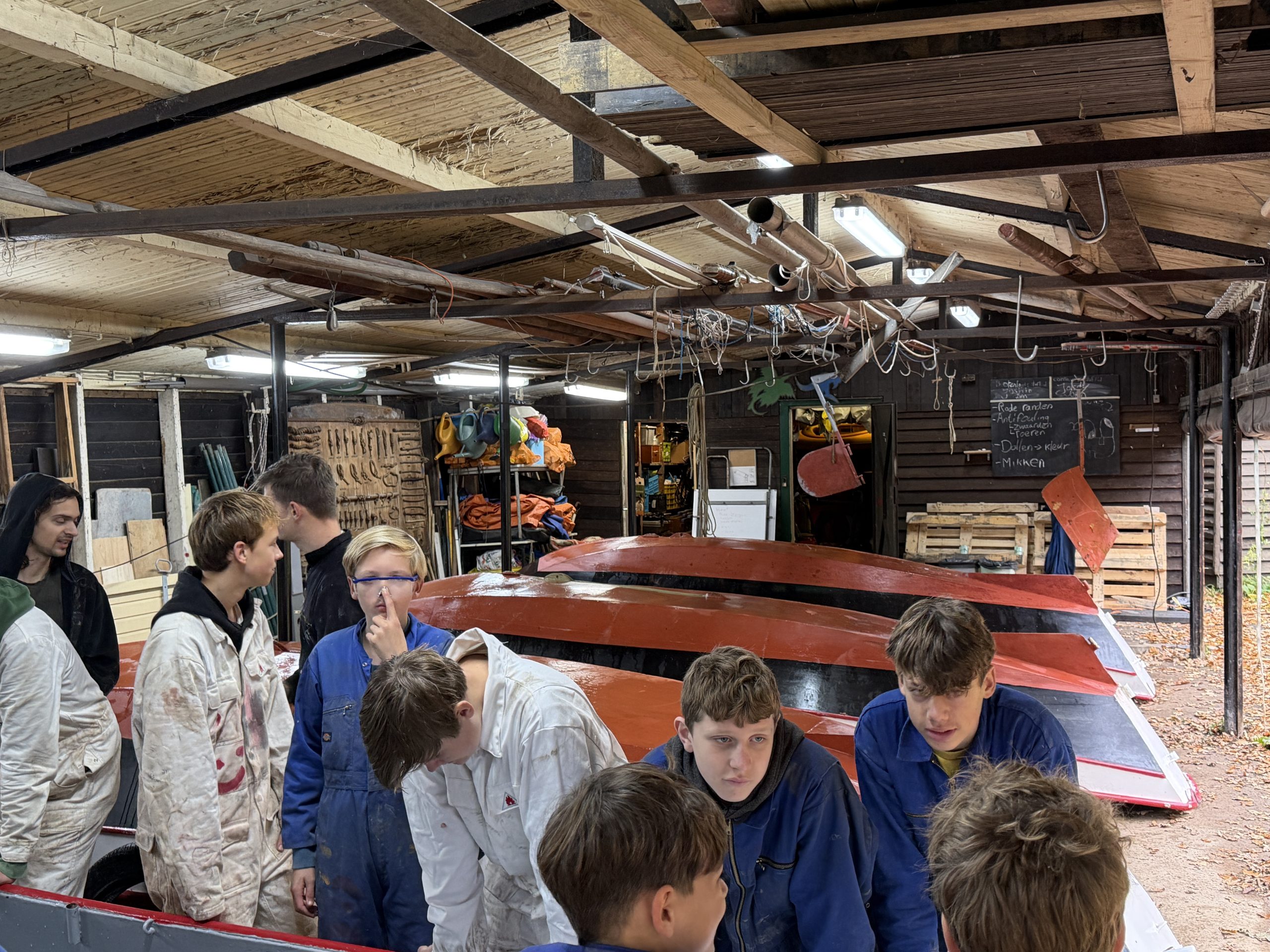 ’s Ochtends zijn we vol energie aan de slag gegaan! De boten werden één voor één uit het water getakeld en naar binnen gereden. Daar draaiden we ze om, zodat we meteen konden starten met het onderwaterschip en nog voor het einde van de dag zat de eerste verflaag er al weer op!